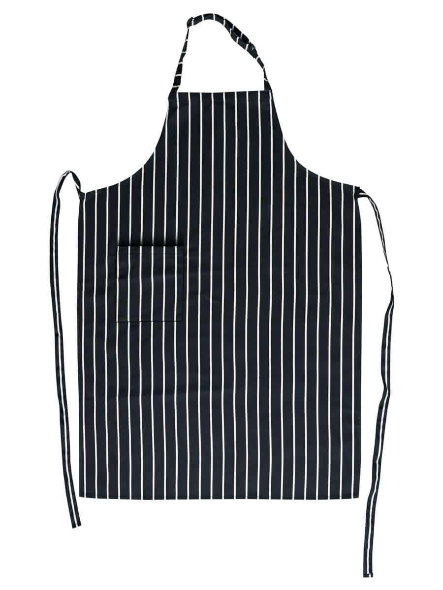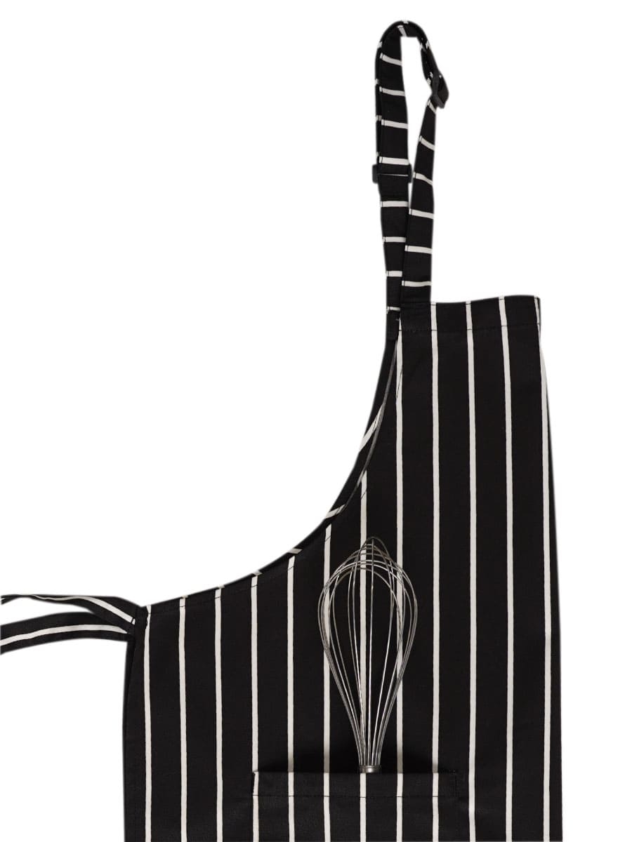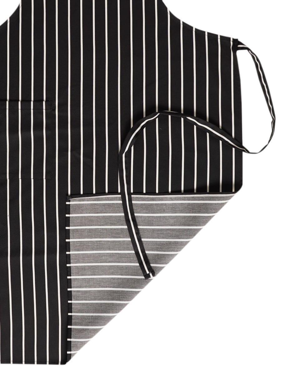 Siyah beyaz çizgili önlük, mutfakta veya servis yaparken şıklığı ve işlevselliği bir araya getiriyor.