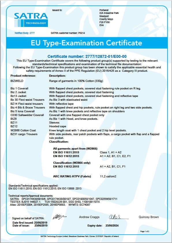 EN ISO 11612 A1+A2, B1, C1, E2, F1