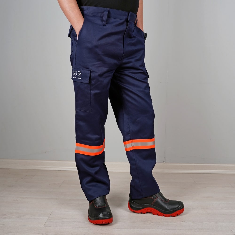 • Diz hizasında yanması geciktirilmiş 50 mm aramid arka yüzeyli turuncu-gri-turuncu reflektif şeritler